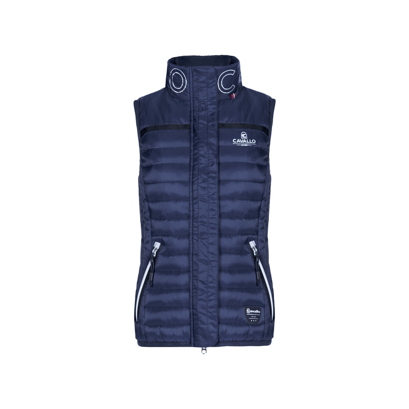 Moderne, wattierte Steppweste mit Stehkragen im sportlichen Look. Leichte, wärmeisolierende Füllung aus Fake-Daune. Modisches Karofutter innen, 2-Wege Frontreißverschluss, durch Frontpatte verdeckt. Zwei vordere Eingrifftaschen mit Reißverschlüssen und Reflexeinsätzen. Dezenter Cavallo Schriftzug auf der linken Brust Cavallo Logo Print auf dem Kragen. Kleines Cavallo Label an der linken Unterseite der Weste. Die leichte Taillierung gibt der Weste die feminine Form. Brustpasse ist mit einem Webband in Kontrastfarbe versehen.